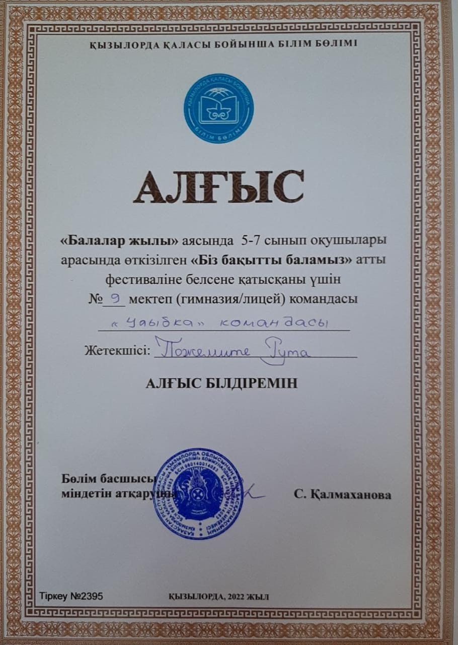 Балалар жылы аясында 7-8 сынып оқушылары арасында өткен " БІЗ БАҚЫТТЫ БАЛАМЫЗ" атты фестивальге белсене қатысқаны үшін мектебіміздің "Улыбка" командасы қалалық білім бөлімінің АЛҒЫСЫМЕН марапатталды. Команда жетекшісі дене шынықтыру пәне мұғалімі Пожемите Рута.